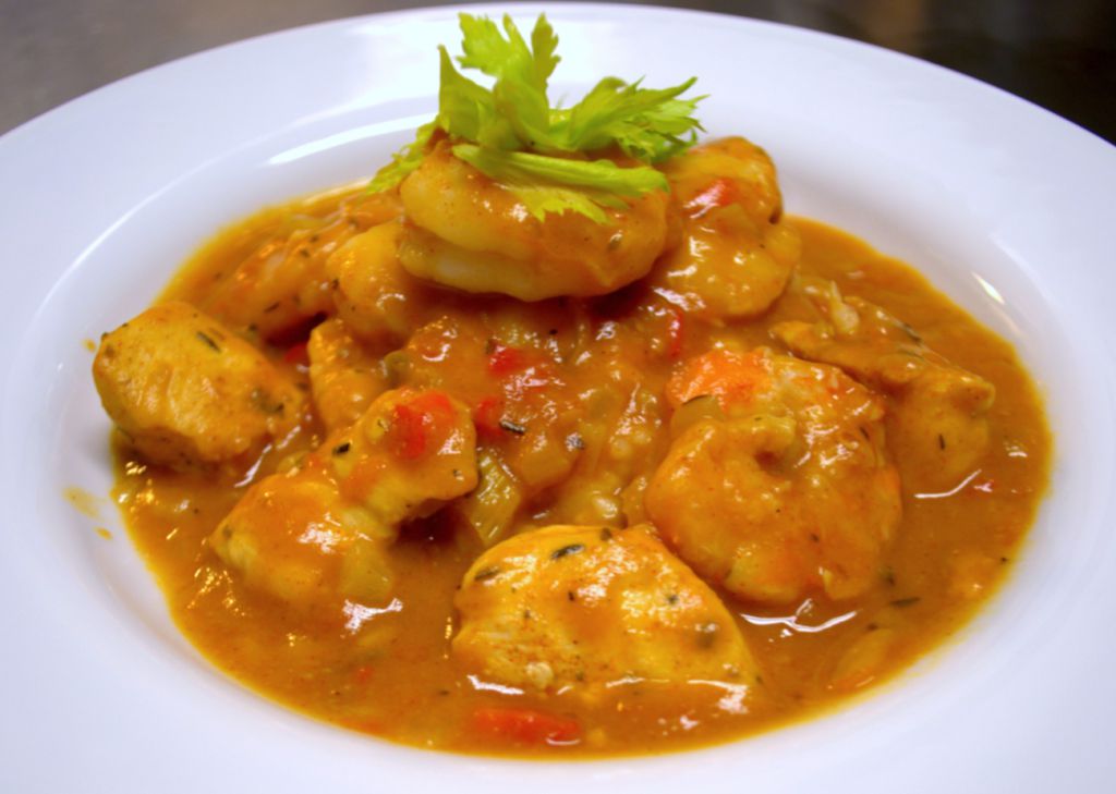 Receta muy antigua de la cocina tradicional catal. Un plato de grandes ocasiones Mar y Montaña donde se combinan carnes y mariscos. Pon en un cuenco la mitad de la harina 2 cucharadas de pimentón dulce 1 de curry tomillo seco y 2 dientes de ajo bien picados.